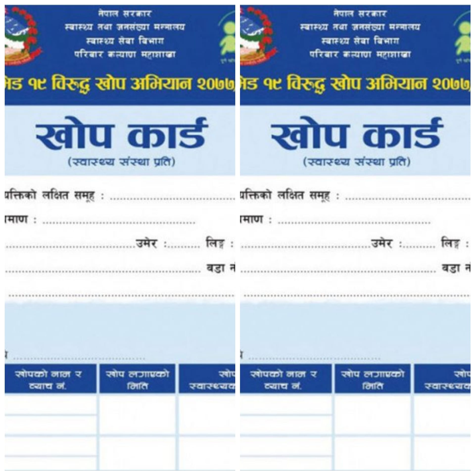 सरकारले यही माघ ७ गतेदेखि सार्वजनिकस्थलमा प्रवेश गर्नका लागि कोरोना भाइरस विरुद्धको खोप कार्ड अनिवार्य गरेको छ । सरकारले खोप कार्ड अनिवार्य गरेसँगै केही मानिसको खोप लगाएको कार्ड हराएकोले नयाँ प्रतिलिपि बनाउनु पर्ने हुन्छ ।