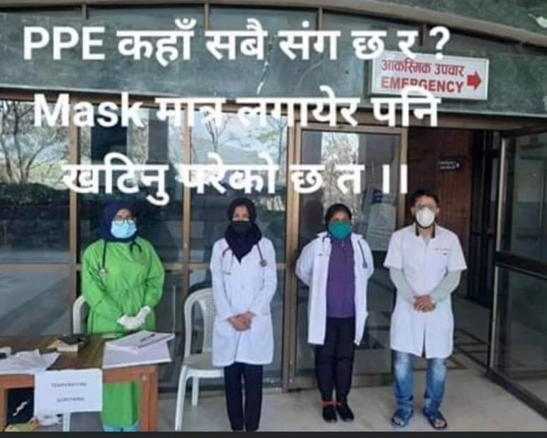 पि पि इ लगाउदा स्वास्थ्यकर्मीलाई रिस्क नहुने होईन रिस्क कम हुने मात्र हो। इटली ,चाइना ,अमेरिका जस्ता देशहरूमा पिपिई लगाएर काम गरेका चिकित्सकहरुको पनि ठूलो संख्यामा मृत्यु भएको खबर छ।नेपालमा पि पि इ कम भए यस्तो महामारीको बेला के हालत होला । बिकसित देशमा यो रोगको नियन्त्रण गर्न गाह्राे छ भने हाम्रो देशमा कस्तो अवस्था होला।