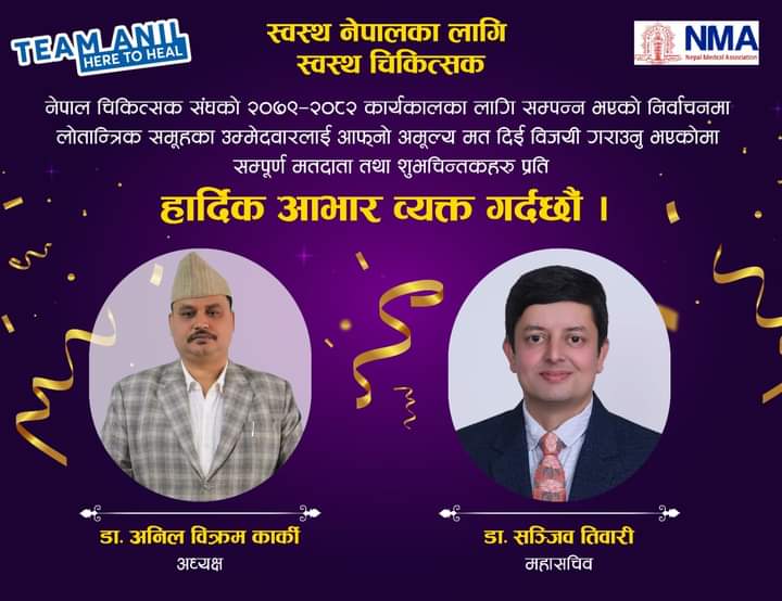नेपाल चिकित्सक संघको अध्यक्षमा लोकतान्त्रिक समूहका डा. अनिलविक्रम कार्की र महासचिवमा डा. सञ्जिव तिवारीको जित सुनिश्चित भएको छ।
