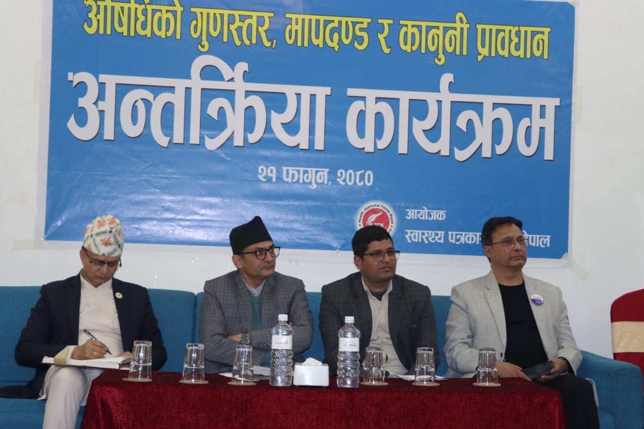 कार्यक्रममा स्वास्थ्य पत्रकार मंचका अध्यक्ष सरोज ढुंगेलले औषधि मानिसको स्वास्थ्यसंग प्रत्यक्ष सरोकार राख्ने भएकोले गुणस्तरिय औषधि उत्पादनमा ध्यान दिनुपर्ने कुरामा जोड दिए।
