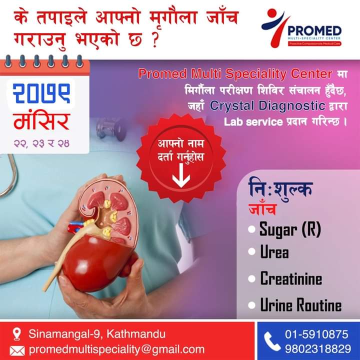 राजधानीको सिनामंगल स्थित प्रोमेड मल्टीस्पेसियालिटी क्लिनिकमा मिर्गौलाकाे नि:शुल्क जाँच हुने भएकाे छ ।