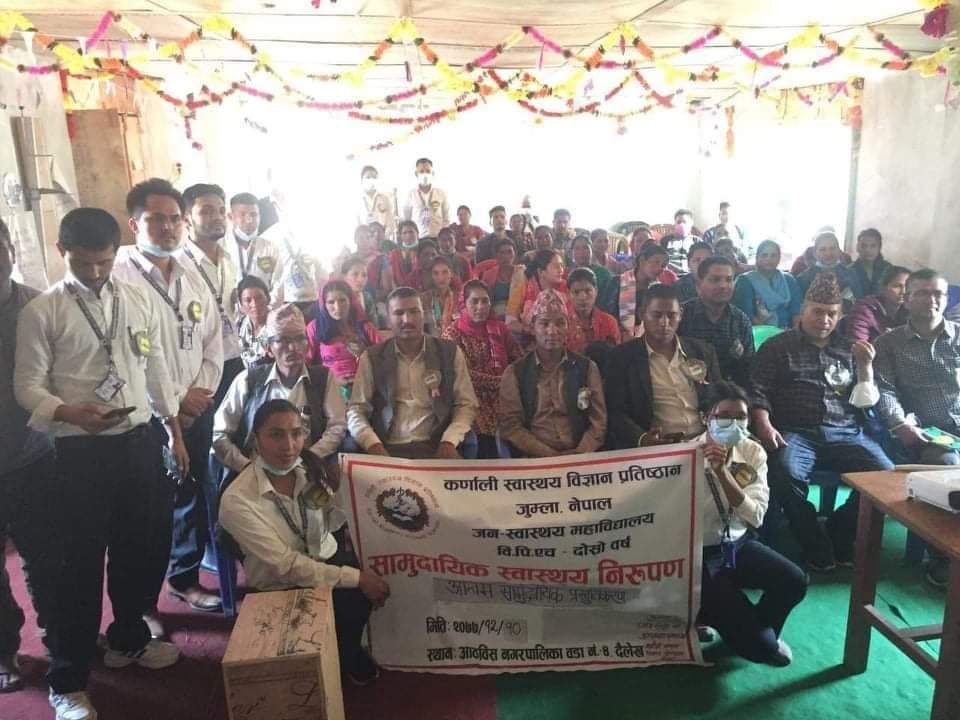 कर्णाली स्वास्थ्य विज्ञान प्रतिष्ठान जुम्ला जन-स्वास्थ्य महाविद्यालय अन्तर्गत जनस्वास्थ्य स्नातक तह दोस्रो वर्ष। (ग्रुप बि ) मा अध्ययनरत विद्यार्थीहरु द्वारा फागुन १२ गतेदेखि सामुदायिक स्वास्थ्य निरुपण कार्यक्रम सम्पन्न भएको छ। चैत्र १० गते सम्पन्न भएको उक्त कार्यक्रममा वडा नं. ४ मा गरिएको स्वास्थ्य सम्बन्धी नमूना सर्वेक्षणबाट विभिन्न १० वटा प्रमुख स्वास्थ्य समस्याहरु खोज अनुसन्धान गरेको छ।