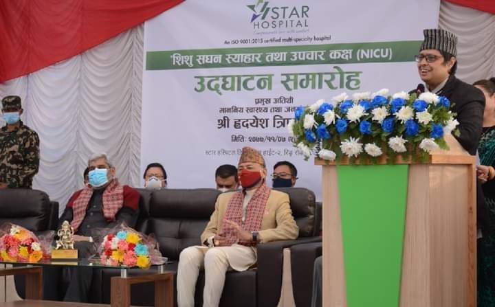 ललितपुर सानेपास्थित स्टार अस्पतालमा शिशु सघन स्याहार तथा उपचार कक्ष (एनआइसियु) को स्वास्थ्य तथा जनसंख्या मन्त्री हृदयेश त्रिपाठीले शुक्रबार उद्घाटन गरेका छन।