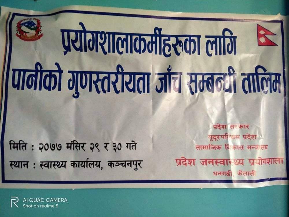 २०७७ मङ्सिर २९ र ३० गते स्वास्थ्य कार्यालय कंचनपुरको तालिम हलमा सुदूरपश्चिम प्रदेशका बिभिन्न अस्पताल तथा प्राथमिक स्वास्थ्य केन्द्रमा कार्यरत प्रयोगशालामा काम गर्ने प्राबिधिक हरुको लागि खानेपानीको गुणस्तरीयता जांच सम्बन्धि तालिम प्रदान गरेको छ ।
